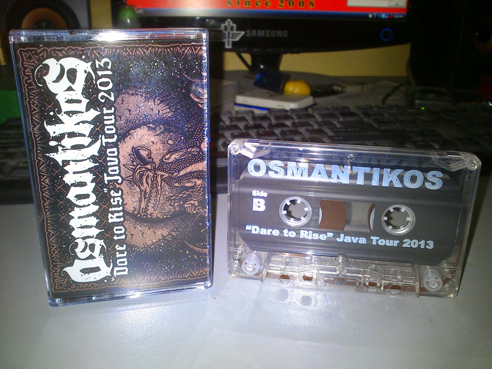 Kaset edisi khas “Dare to Rise” merupakan diskografi penuh koleksi rakaman OSMANTIKOS dalam karier mereka sebagai pemuzik punk/crust/hardcore. Saya pada mulanya tersalah tafsir mengatakan ini adalah rakaman ‘live’ mereka sepanjang tour mereka di Indonesia pada Oktober tahun lalu yang merentas bandar Kediri, Jogjakarta, Bandung dan Jakarta.